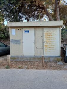 La plage se situe à droite avant la voie sans issue, face au poste telecom.